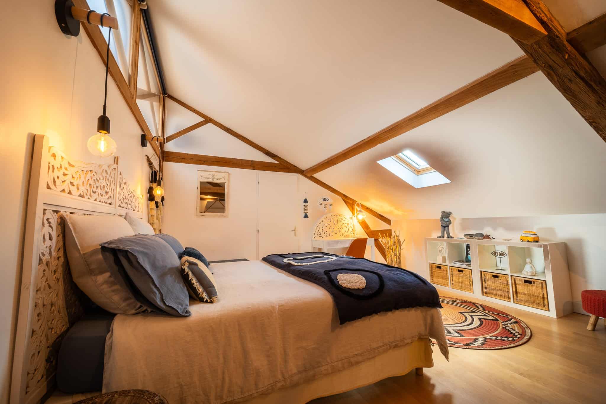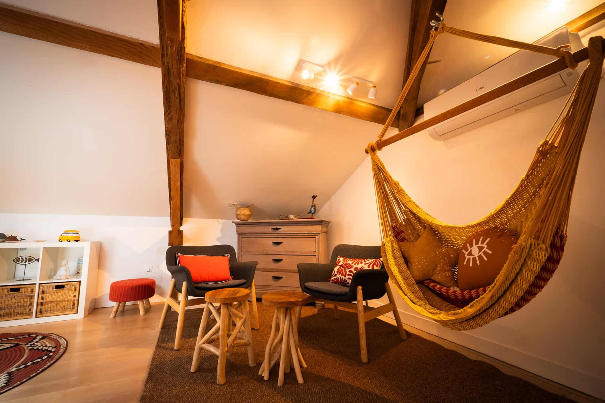 Au deuxième étage, cette grande suite de 40m2 aux poutres apparentes et son beau hamac est propice à la détente après une journée à la plage ou à visiter les Châteaux alentour.