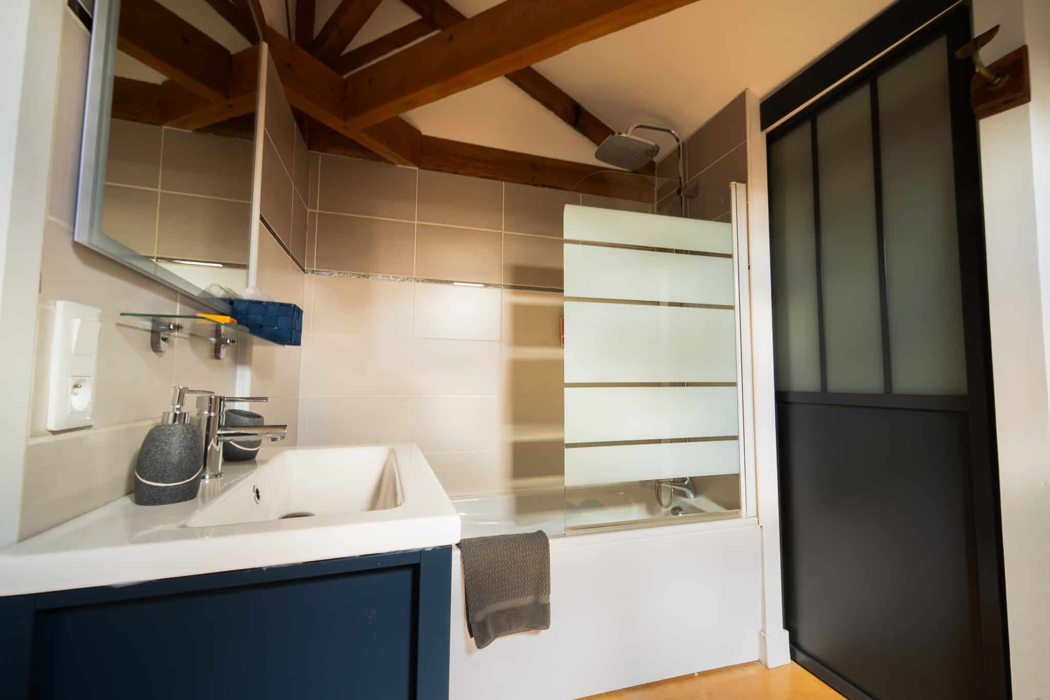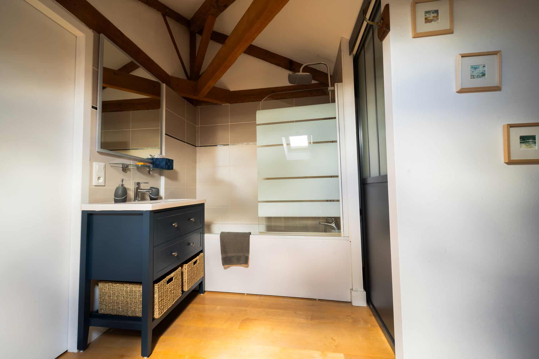 Salle de bain et un WC séparé spacieux. Un grand espace détente ainsi qu’un coin bureau sont à votre disposition.