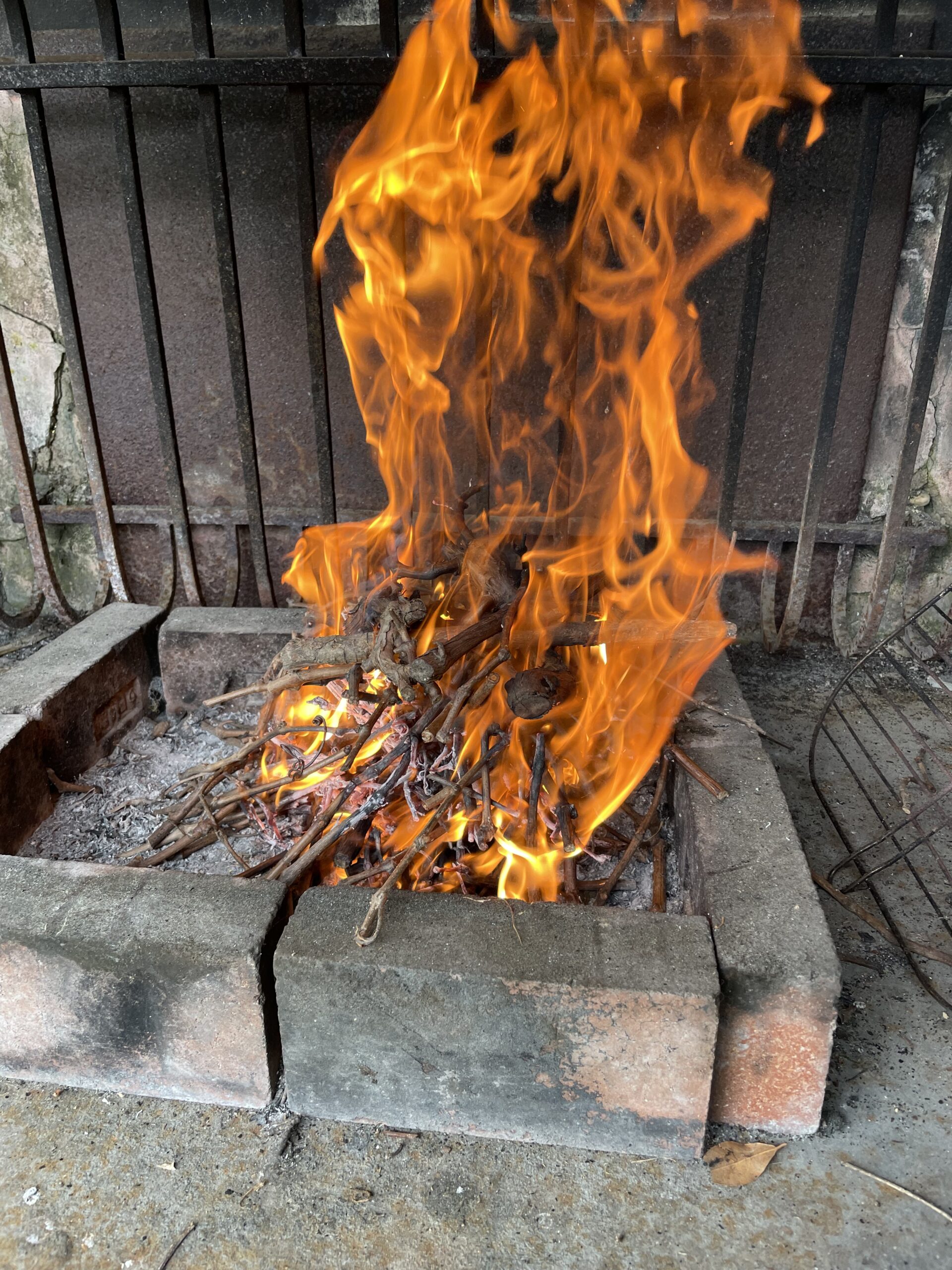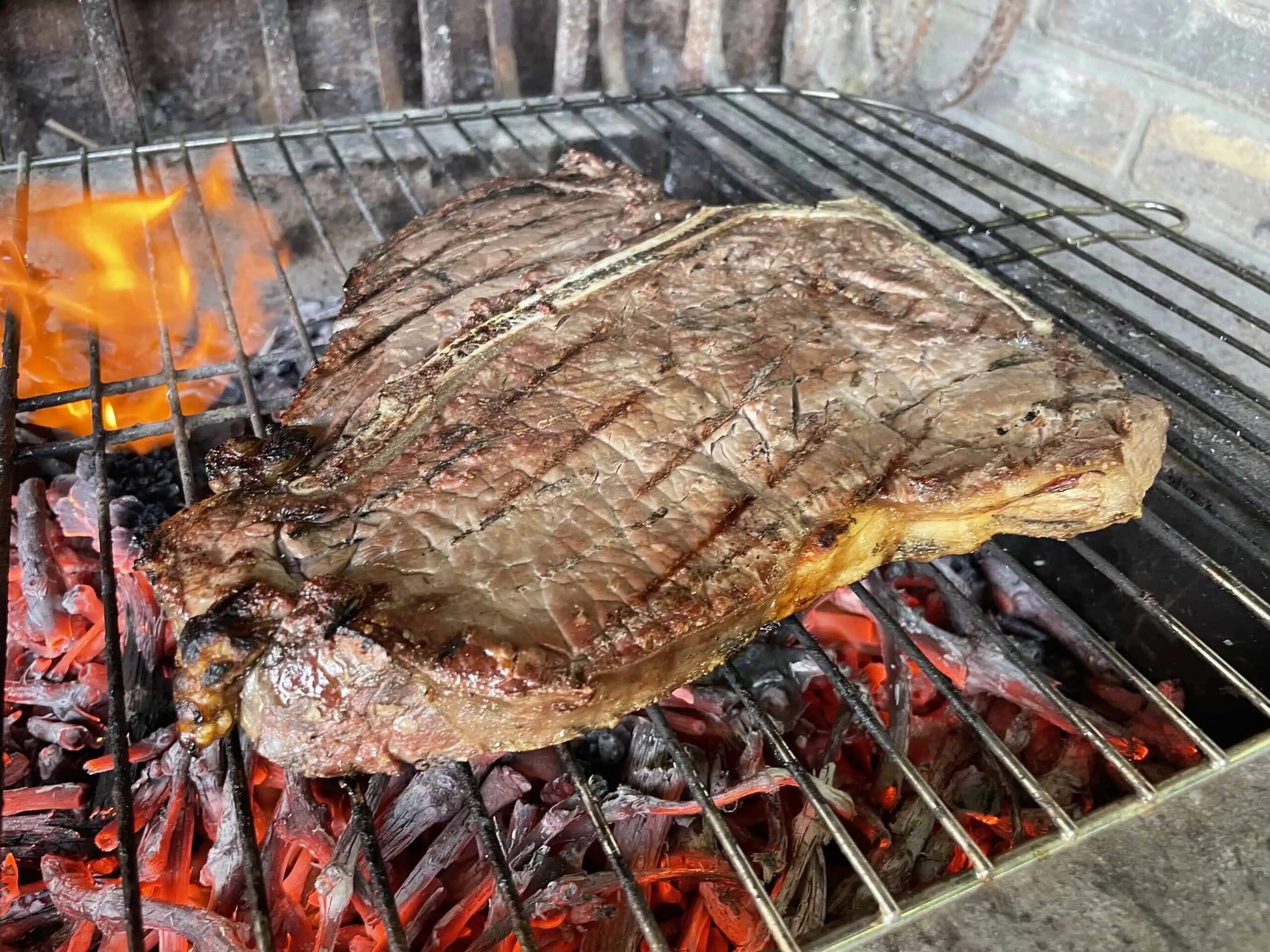 Après le travail, place à la fête ! Nous avons allumé le barbecue, mais pas avec du charbon ordinaire – avec des sarments de vigne. Ces branches de vigne brûlent très chaud et donnent à la viande un goût incomparable. Au menu : un énorme T-bone de chez Pigoud by Dylan, le boucher local de Saint-Estèphe.