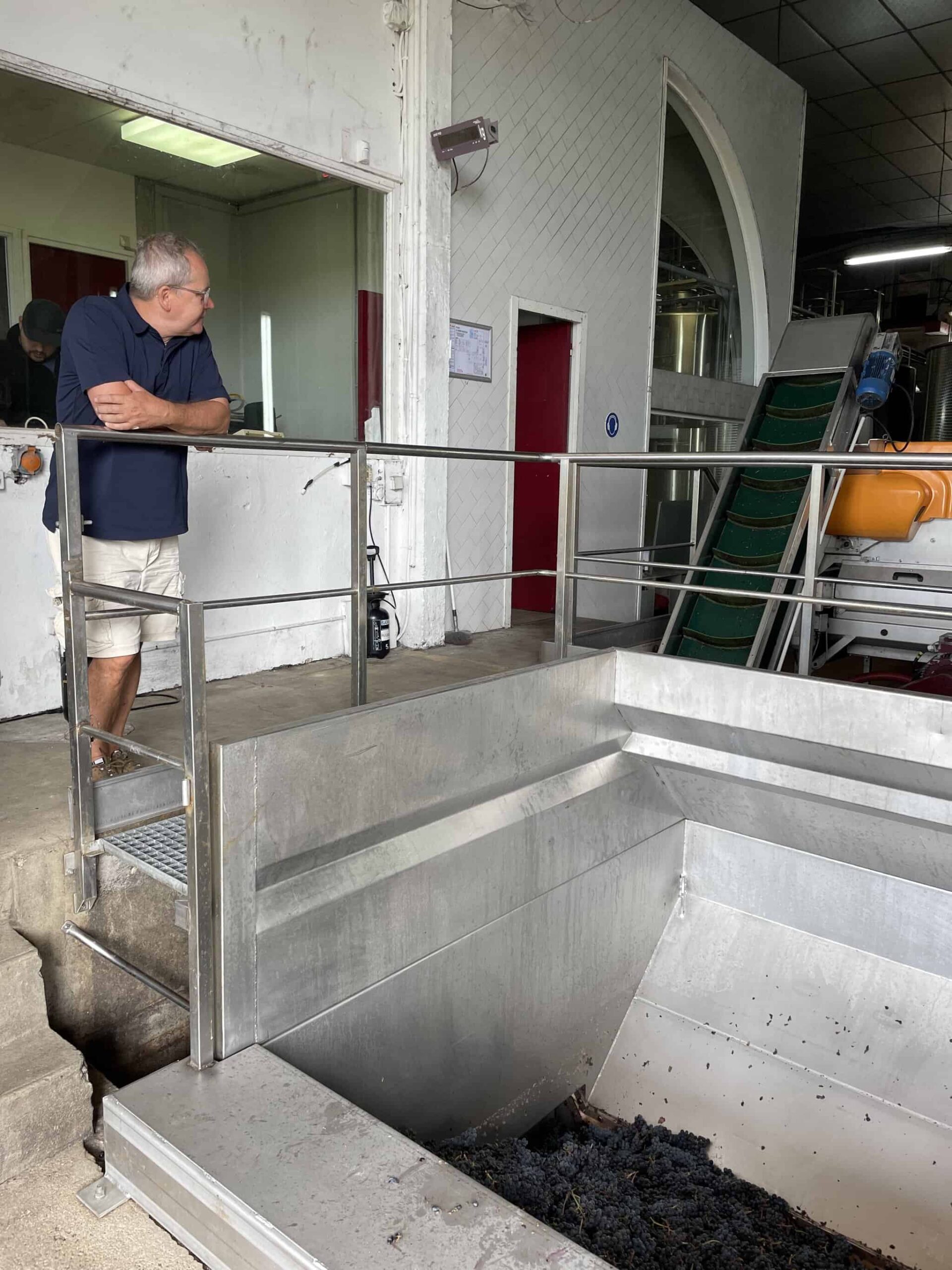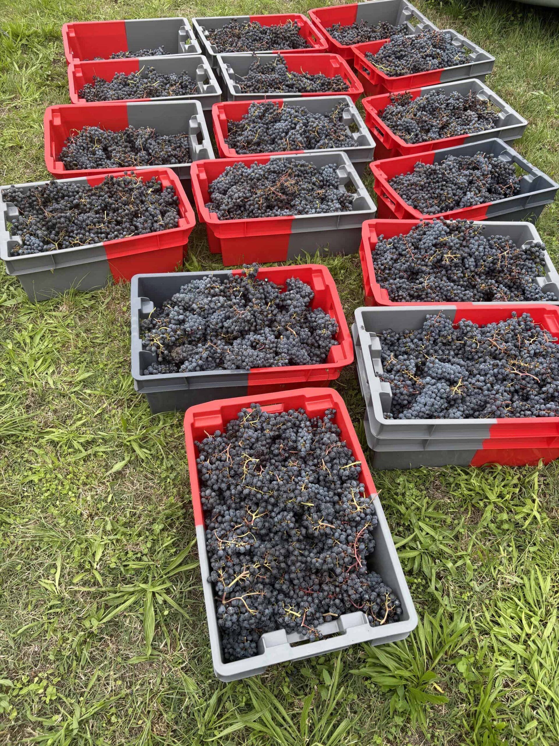 Nous avons investi cette année dans de nouveaux bacs de transport – des vrais bacs de vendange rouges et gris qui facilitent vraiment le travail. Notre petite parcelle de 0,2 hectare est plantée moitié Merlot, moitié Cabernet Sauvignon, le classique assemblage stéphanois.
